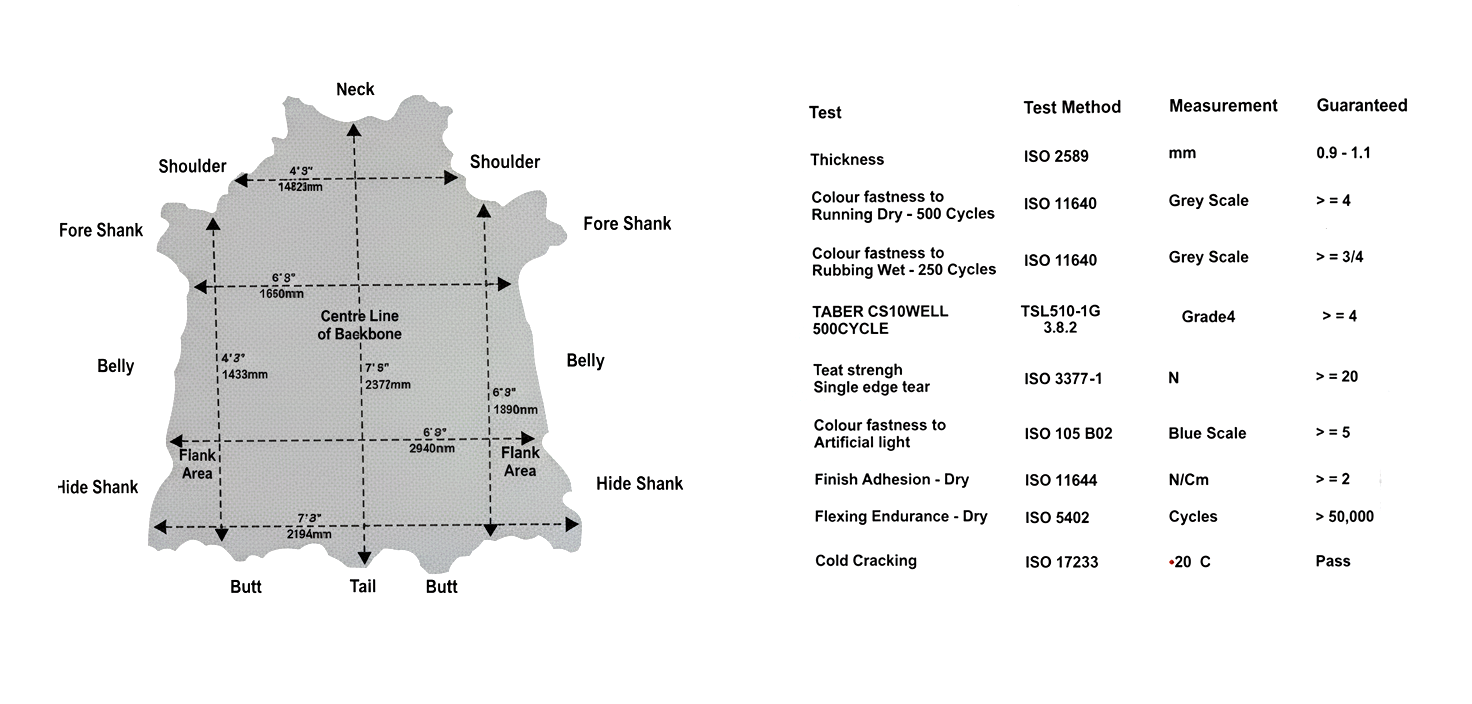 Leather can be ordered by the hide or square feet (min. 1 hide). Typical hide sizes range from 35–65 sq. ft. Measurement is done electronically (avg. 52 sq. ft. = 4.83 sq.m). A linear meter of 50”–54” fabric equals 18 sq. ft. (1.67 sq.m) of leather. Perfect for upholstery, furniture, auto interiors, and more.